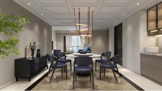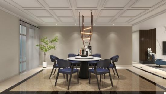 造型別致的吊燈、排列有致的射燈,營造浪漫溫馨的用餐氛圍。CBD家居·黑金 | HZ205餐桌,雙層大理石圓桌面溫潤秀潔,觀感、觸感皆得美的體驗(yàn),靈活旋轉(zhuǎn),讓生活更便捷,黑色錐形臺(tái)柱奠定沉穩(wěn)氣韻,守護(hù)三餐四季。