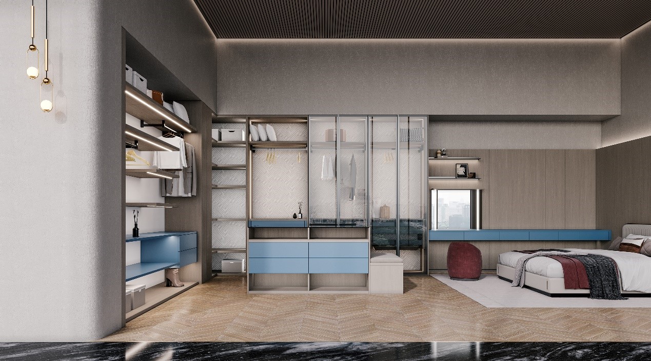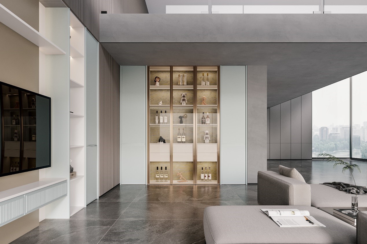 這套產(chǎn)品主要針對大平層的戶型設(shè)計(jì),開放式的客廳,開放式的廚房,開放式的臥室,開放式的衣帽間,一種無拘無束的感受,也是當(dāng)下年輕人比較鐘愛的生活方式。這款產(chǎn)品有兩大特點(diǎn):幾何式的產(chǎn)品結(jié)構(gòu),讓產(chǎn)品構(gòu)建更加簡潔干凈;層板內(nèi)斜45度的工藝亮點(diǎn),讓視覺感更加的聚焦,更加有內(nèi)部延伸感。