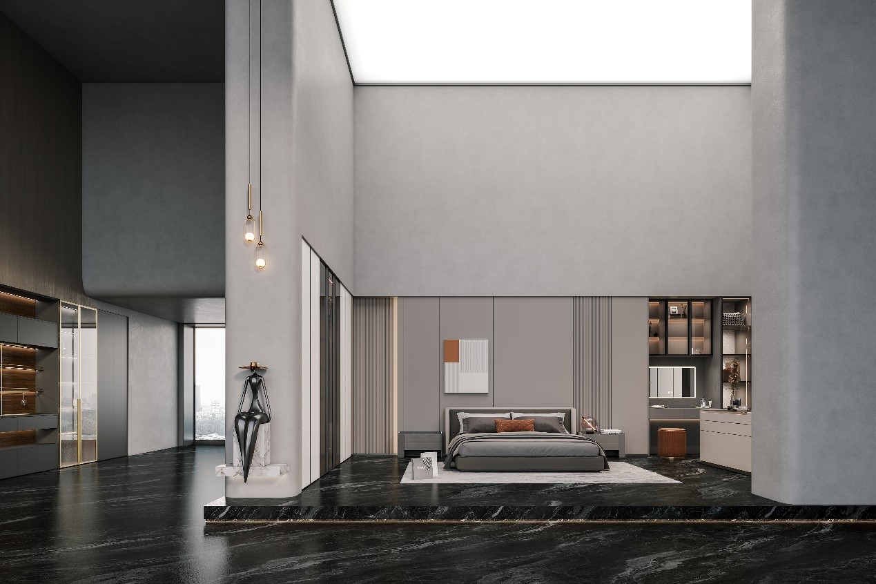 該系列現(xiàn)代輕奢風(fēng)格的作品偏適適30-45歲人群,150-200㎡的戶型設(shè)計(jì)。該系列門板采用全進(jìn)口PET,獨(dú)特的膚感特性與金屬光澤,與格柵、石紋、木紋等家居元素對撞、映襯,營造出極致而樸質(zhì)的人文空間。