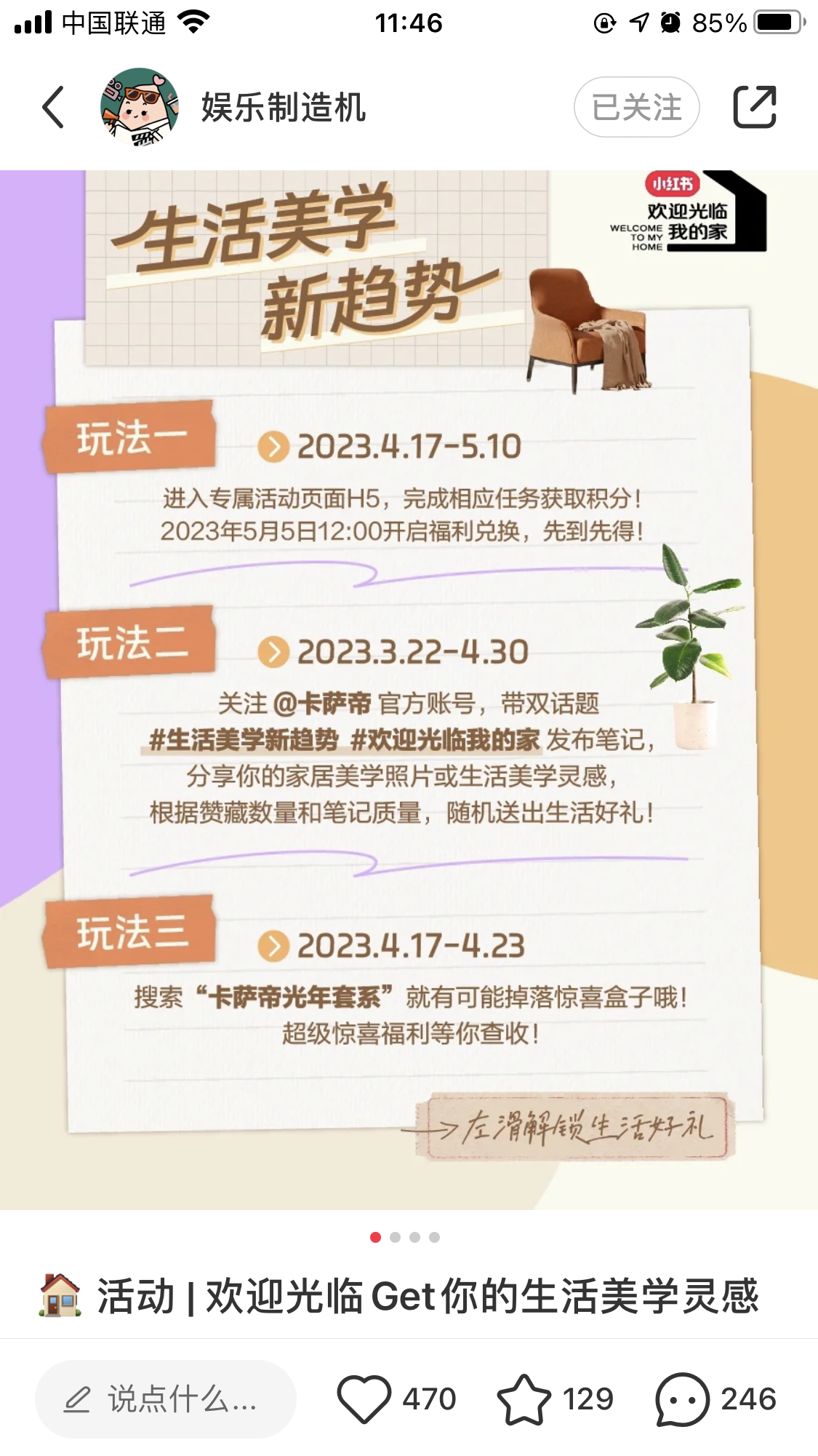 活動(dòng)由小紅書(shū)官號(hào)@娛樂(lè)制造機(jī)以#生活美學(xué)新趨勢(shì) 話題發(fā)起號(hào)召,背靠站內(nèi)濃厚的社區(qū)分享氛圍,成功搶占話題熱度。
