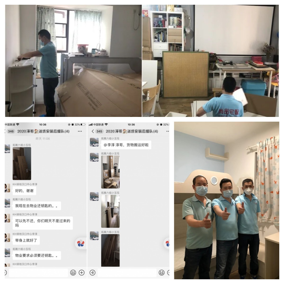 陳經(jīng)理在與物業(yè)溝通后,提前做好準(zhǔn)備,反復(fù)與師傅確定具體上門(mén)時(shí)間以及安裝人數(shù)。由于客戶(hù)在老家沒(méi)回到武漢,陳經(jīng)理建立起“客戶(hù)家送貨安裝后援隊(duì)”的微信群,設(shè)計(jì)師上門(mén)幫客戶(hù)收貨,在群里播報(bào)送貨進(jìn)度,師傅送完后讓設(shè)計(jì)師把收貨清單發(fā)在群里讓客戶(hù)確認(rèn),實(shí)時(shí)為客戶(hù)播報(bào)現(xiàn)場(chǎng)情況使其放心。
