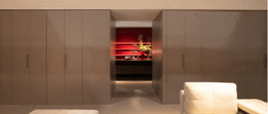 Wing door (舞動的翅)| 該空間視覺借由大面積門板,運用意大利進口折門五金系列營造多種隱藏式場景空間,借由空間的極簡,隱藏凌亂的生活瑣碎。讓空間更簡單,開啟更方便,使用更安全。