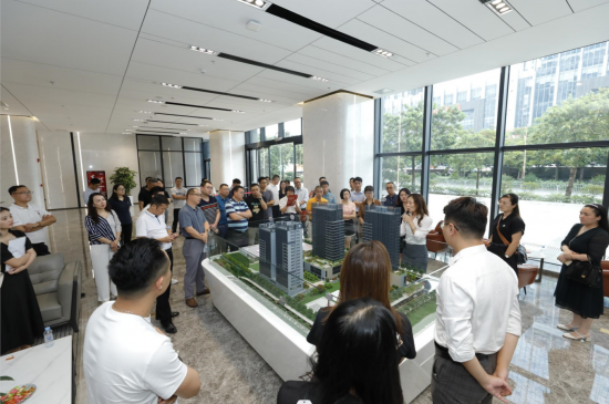 在左右云創(chuàng)谷1棟B座一樓大廳,導(dǎo)游客服在沙盤前向與會嘉賓講述了左右云創(chuàng)谷的地理環(huán)境優(yōu)勢和功能布局。