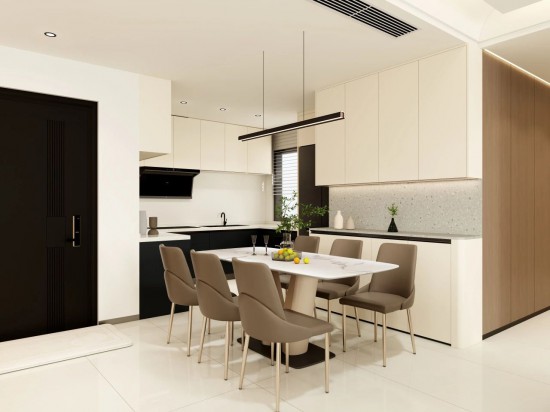 一半清歡,一半煙火,從客廳橫向延伸便抵達(dá)餐廚區(qū),設(shè)計(jì)采用了上淺下深的色彩搭配,既美觀又實(shí)用。餐臺的維多利亞白彩晶石臺面,如同皎潔的明月,光影中閃爍著璀璨的光芒,一抹綠色的生機(jī)注入,又激蕩出無限活力。右側(cè)的背景柜巧妙穿插了水磨石元素,既保證了空間的通透性,又劃分了不同置物區(qū)域,讓整體布局更加合理且富有層次。