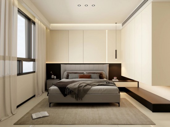 次臥的整體設(shè)計(jì)摒棄了傳統(tǒng)的奢華浮夸之風(fēng),以純白暖灰色調(diào)為主。無主燈的設(shè)計(jì)讓空間更顯簡潔,背景墻采用不同白色格柵板拼接裝飾,配合黑色高級質(zhì)感床頭柜,增添了空間的層次感和質(zhì)感。