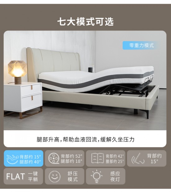 睡前再開啟零重力模式,床架背部抬升 15°,腿部抬升40°。躺在床上盡情拉伸,幫助血液回流,緩解久坐壓力,放松全身,加快入睡。七種模式輕松切換,釋放所有壞情緒,只留下純粹的快樂。