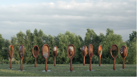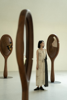 她設(shè)計(jì)了十二枚鏡面,構(gòu)成一個(gè)橢圓形裝置,象征生命的循環(huán)往復(fù)與時(shí)間的永恒流動(dòng)。每一枚鏡子背后展示了對(duì)應(yīng)月份的花卉,象征自然界的變化與生命的節(jié)奏。鏡面采用了特別定制的幽靈鏡效果,具有漸變的反射能力;使觀眾在鏡前不僅能看到自己的倒影,還能模糊地感知到背景中的年輪圖案。這種交互效果使得觀眾的身影與自然的紋理相融合,增強(qiáng)了人與自然的連接感。觀眾可以在鏡面之間隨意走動(dòng),觀察不同鏡面的花卉與自己的倒影,與時(shí)間對(duì)話,回顧過(guò)去、審視現(xiàn)在并展望未來(lái)。
