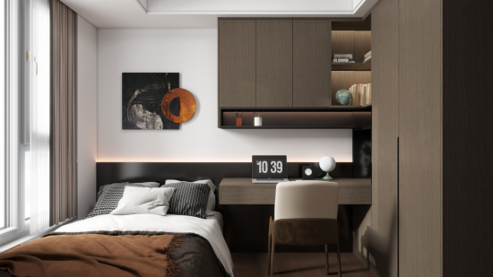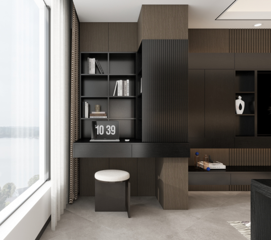 功能房保持統(tǒng)一風(fēng)格,更注重功能實(shí)用性,以半開放式格柜和懸浮架設(shè)計(jì)擴(kuò)大視野,成就摩登時尚。