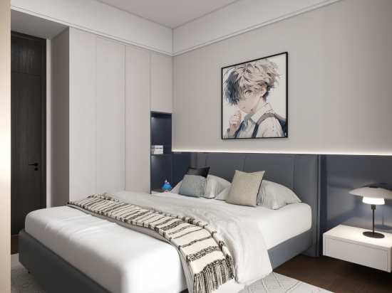 兒童房在極簡基調(diào)上,于1/3處橫裝飾板,內(nèi)嵌燈帶和掛畫強(qiáng)勢出圈,打造濃厚的個人特色。