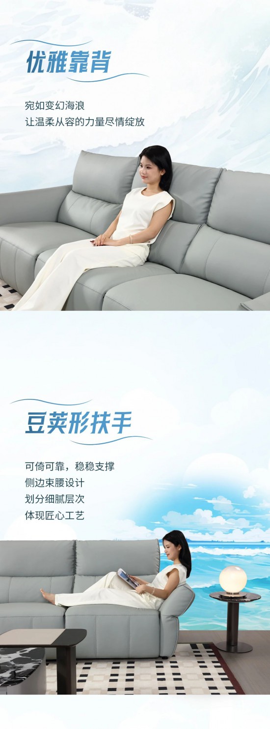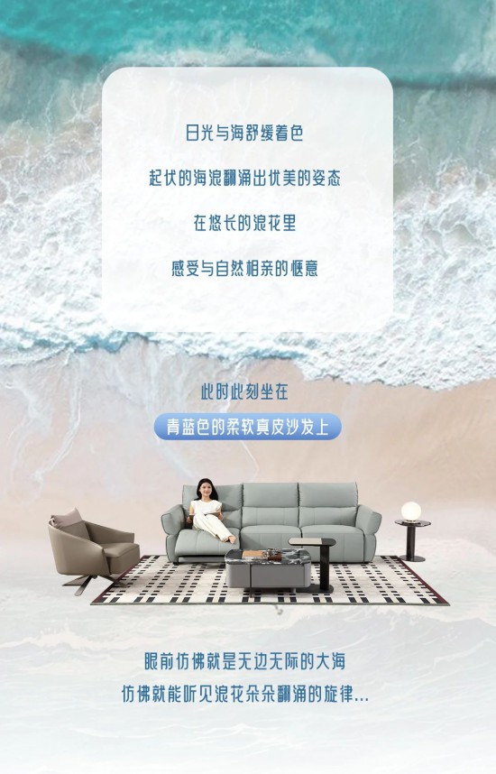 核心提示:日光與海舒緩著色,起伏的海浪翻涌出優(yōu)美的姿態(tài)。在悠長(zhǎng)的浪花里,感受與自然相親的愜意。此時(shí)此刻坐在青藍(lán)色的柔軟真皮沙發(fā)上,眼前仿佛就是無(wú)邊無(wú)際的大海,仿怫就能聽(tīng)見(jiàn)浪花朵朵翻涌的旋律。