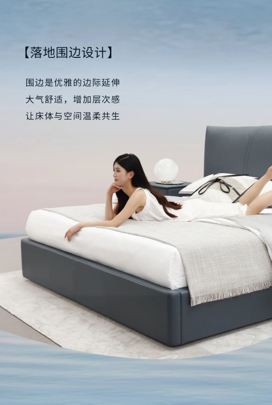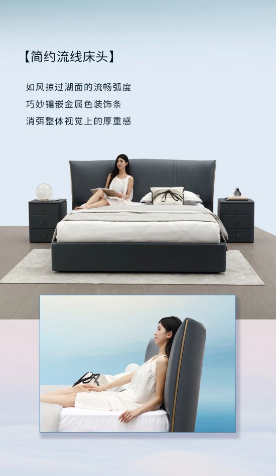 核心提示:簡約流線床頭,如風(fēng)掠過湖面的流暢弧度,巧妙鑲嵌金屬色裝飾條,消弭整體視覺上的厚重感。