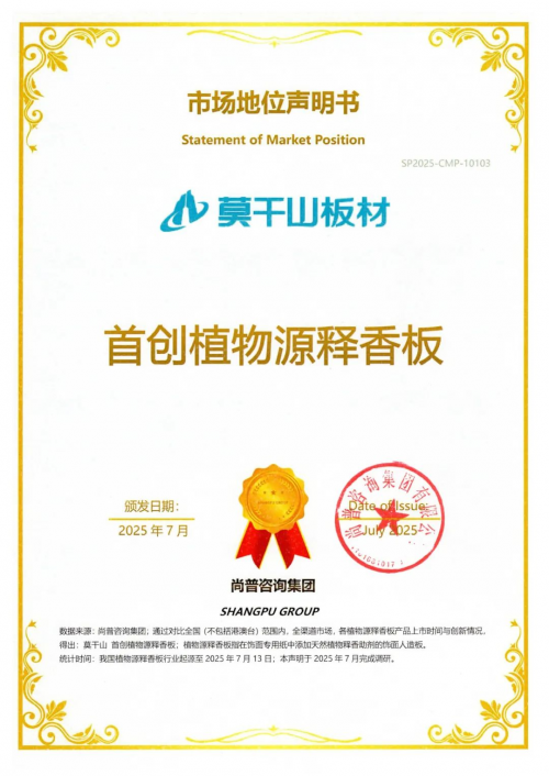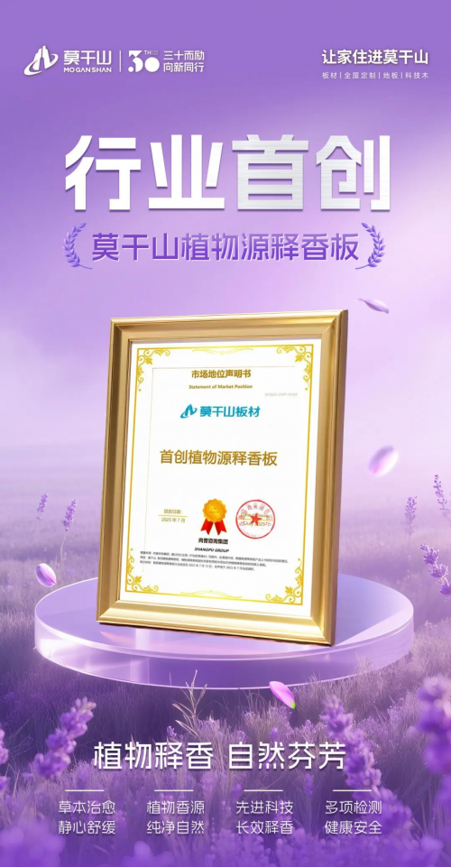 當(dāng)家居消費(fèi)從“功能需求”轉(zhuǎn)向“情緒價(jià)值”,莫干山板材以植物源技術(shù)交出了一份創(chuàng)新答卷。近日,尚普咨詢(xún)正式認(rèn)證莫干山板材“首創(chuàng)植物源釋香板”身份,并出具《市場(chǎng)地位聲明書(shū)》。這一認(rèn)證不僅標(biāo)志著云峰莫干山在板材功能創(chuàng)新上的領(lǐng)跑地位,更為家居行業(yè)開(kāi)辟了“功能+情緒”的全新賽道。