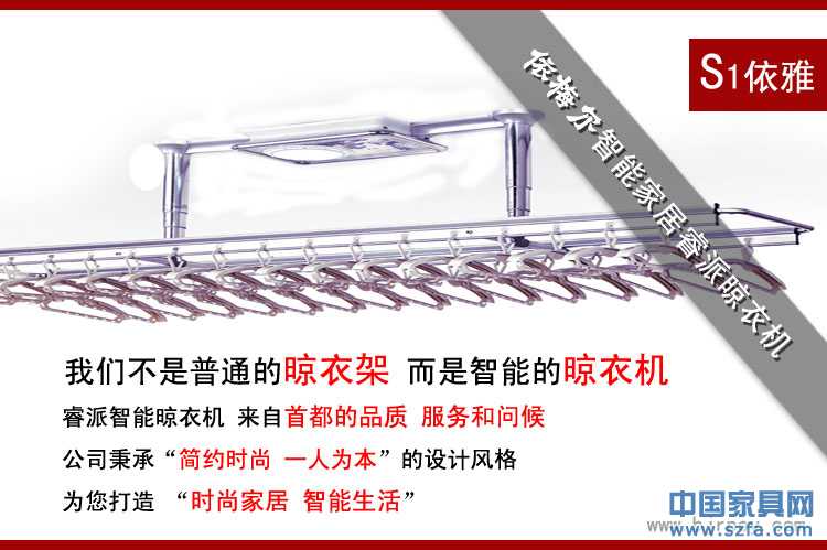 晾衣架是當(dāng)今家庭必備的一種生活用品,隨著現(xiàn)代人們生活水平提高,消費(fèi)觀念的轉(zhuǎn)變而對(duì)生活用品的要求不斷提高,傳統(tǒng)而簡(jiǎn)易的晾衣方式遠(yuǎn)遠(yuǎn)滿足不了現(xiàn)代的需求,智能化晾衣架產(chǎn)品在技術(shù)上,做工上,宣傳上和推廣上目前都是空缺,唯獨(dú)依梅爾智能家居填補(bǔ)了這一空缺,高貴的依梅爾智能家居系列,普通消費(fèi)者所能接受的產(chǎn)品,它以高貴時(shí)尚的產(chǎn)品而不貴的價(jià)格方式為消費(fèi)者帶來(lái)生活中的享受,它以精簡(jiǎn)、時(shí)尚、高雅,為依托所生產(chǎn)的產(chǎn)品面向廣大普通消費(fèi)者,它所創(chuàng)造的是家居智能一體化,風(fēng)格時(shí)尚現(xiàn)代化,給當(dāng)今家庭增添了一道可選任意組合的家居大餐,價(jià)格是次要,風(fēng)格是主要。