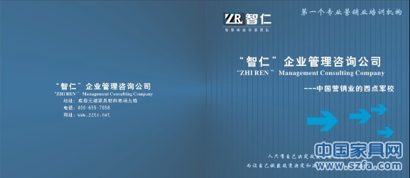 2012年因公司發(fā)展,在四川成都,設(shè)立:“智仁•中國”企業(yè)管理咨詢公司。本公司一直致力研究:家具行業(yè)銷售與管理、市場拓展與維護(hù)、企業(yè)文化建設(shè)與傳承。經(jīng)過數(shù)十年的研究、論證與各種戰(zhàn)略,戰(zhàn)術(shù)的實(shí)施,對(duì)家具行業(yè)所面臨的瓶頸以及全套解決方案已擁有大量的實(shí)戰(zhàn)型模塊,以及大量的實(shí)戰(zhàn)型人才。對(duì)解決:家具企業(yè)發(fā)展管理模塊建立、團(tuán)隊(duì)建設(shè)與打造、市場拓展與維護(hù)、企業(yè)文化建立與傳承、終端管理與建設(shè)等所有瓶頸與困難擁有一套:實(shí)際操作性最強(qiáng)、企業(yè)承擔(dān)成本最低、收效最快的整體解決方案。