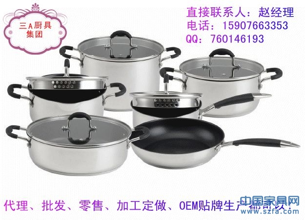 高檔不銹鋼廚具、湯鍋、炒鍋、煎鍋、奶鍋、蒸鍋、刀叉、碗筷碟子等眾多款式,批發(fā)、零售、代理還可以加工定做,OEM貼牌生產(chǎn)!廠家直銷?。?!櫥柜、炊具等產(chǎn)品配套的最佳選擇!消費(fèi)者最愛的禮品,贈(zèng)品!