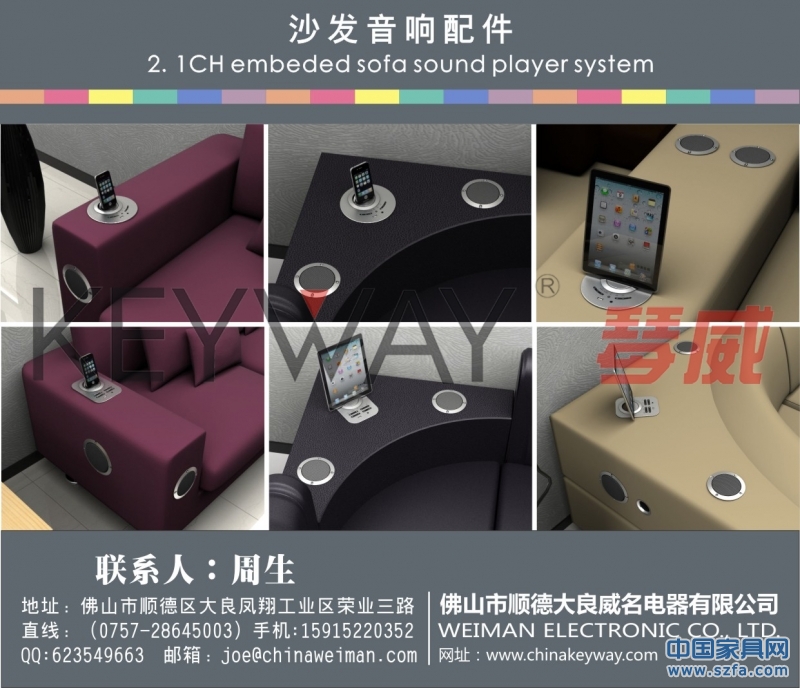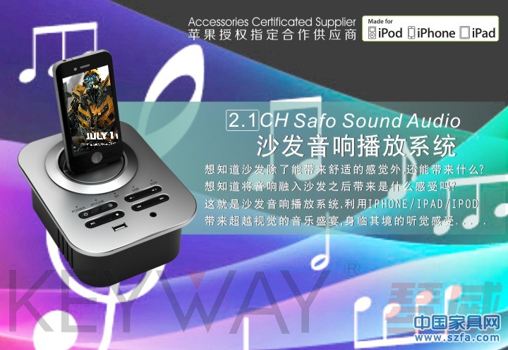 我司(佛山市順德大良威名電器有限公司)設(shè)計生產(chǎn)的2.1CH嵌入式沙發(fā)音響放器系統(tǒng),用戶可將它嵌入沙發(fā)中,安裝方便快捷,是沙發(fā)也是ipod/ipad/iphone音響,我司是直接蘋果公司授權(quán)的指定合作供應(yīng)商,內(nèi)置了直接蘋果公司授權(quán)的無線視頻解碼器功能,通過2.4G高清無線視頻輸出,讓嵌入沙發(fā)音響播放器與電視機同步演繹,視頻高清流暢,品質(zhì)卓越,音質(zhì)純正優(yōu)美。讓用戶在家也可以享受到頂級的視聽盛宴。