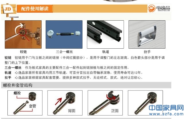 安裝說明:產(chǎn)品都是原封包裝發(fā)貨,貨到要求自己組裝。配件齊全,孔眼都已經(jīng)打好, 用螺絲擰上就可以了。安裝不難,但還是需要一些基本的機械知識以及一點領(lǐng)悟能力的,如 果您對此一竅不通,我們還是建議您找個木匠師傅幫忙安裝。如果有遇到什么問題,可以隨 時聯(lián)系我們,我們技術(shù)員可以指導您!另外我們的板材是優(yōu)質(zhì)板材,密度大,比較沉,安裝 是個體力活。如果您是MM,而且購買的是大件的話,我們不建議您自己安裝。