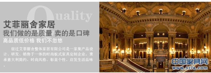 艾菲麗舍依托高科技創(chuàng)新產(chǎn)品的新概念,擁有數(shù)碼化虛擬設計、數(shù)碼化虛擬生產(chǎn)、數(shù)碼化虛擬裝配系統(tǒng)。同時擁有先進自動生產(chǎn)設備,還有一批來自外資大型企業(yè)年輕而富有創(chuàng)造力的營銷精英、設計團隊、以及從事板式家具加工生產(chǎn)多年的專業(yè)技術(shù)人員。傾力打造高品質(zhì)家具,滿足國內(nèi)外消費者的不同需求。