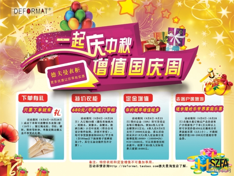活動期間(9月6日-9月23日)預付定金(總金額50%)即可相享受定金每日增值2%。我們下面以A客人總貨款預算2萬,定金50%即1萬元計算,計算方式請進入: http://deformat.taobao.com 查看