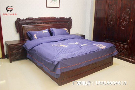 床頭柜上下兩個抽屜,與床箱雕刻相統(tǒng)一,手工打磨的元寶型凹槽拉手,