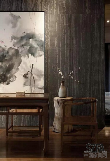 我們追求的是表面的質(zhì)感和肌理,不同質(zhì)感和肌理的材質(zhì)對(duì)比正如同不同形體體塊的互相對(duì)話,為了暖和硬朗的材質(zhì),設(shè)計(jì)師在細(xì)節(jié)之處為用心,無(wú)論是走道上看似隨意擺放的佛像、枯枝,還是那些做工精良的中式家具、置于展示柜內(nèi)的精美瓷器與茶具,這些細(xì)微之處的累積都讓空間顯得更為飽滿。