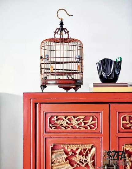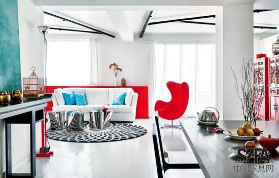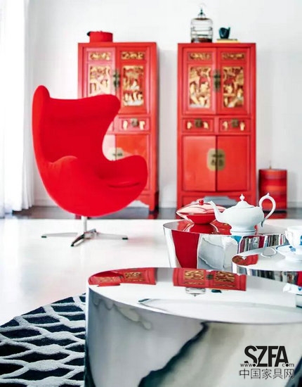 客廳。中國(guó)的傳統(tǒng)雕花立柜和蛋椅因?yàn)槎际羌t色,而絲毫沒(méi)有違和感。