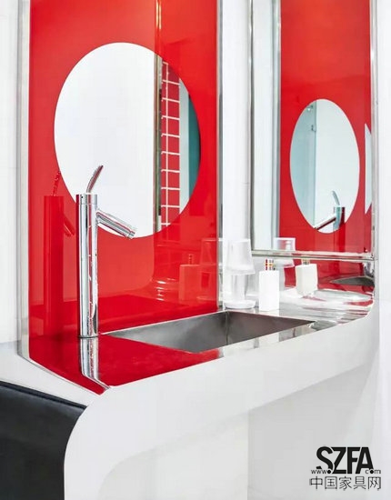 她的家?guī)缀跏堑赇伒囊话?ldquo;變相演繹”:大面積白色打底的空間,紅色的家具、紅色的飾品穿插其間。