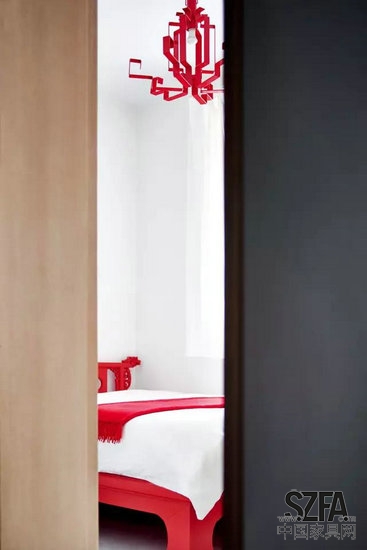客臥一角。不變的紅與白主題,簡(jiǎn)化成現(xiàn)代設(shè)計(jì)線條的宮燈是空間的亮點(diǎn)。