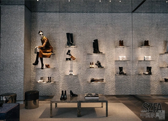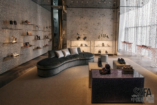 Peter Marino 負(fù)責(zé)室內(nèi)設(shè)計,單色沉穩(wěn)的地板設(shè)計,光潔的鏡面背景墻飾,纖維織物展示架,無不透露著高大尚的氣息。片狀的玻璃墻鑲嵌于建筑立面之間,使室內(nèi)獲得自然采光,奢華且具光澤感的設(shè)計與室內(nèi)陳設(shè)品和當(dāng)代藝術(shù)作品相得益彰,甚至店內(nèi)的玻璃休閑座椅也是出于著名日本設(shè)計師Nendo之手。