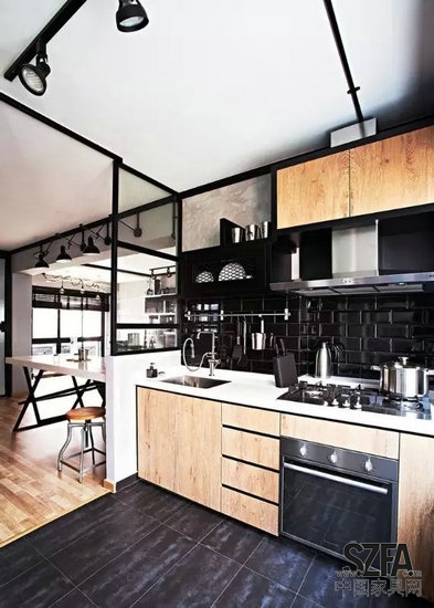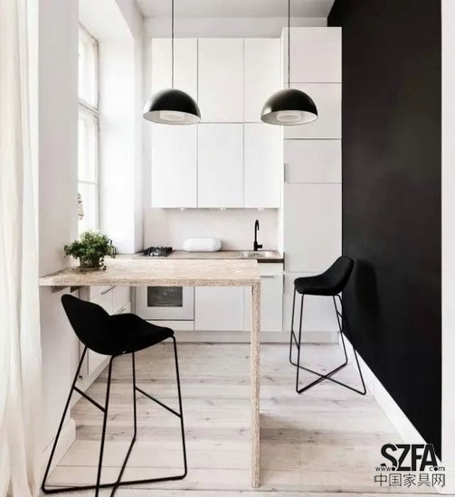 大面積的黑白對(duì)比讓不大的廚房空間充滿個(gè)性。