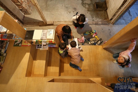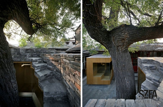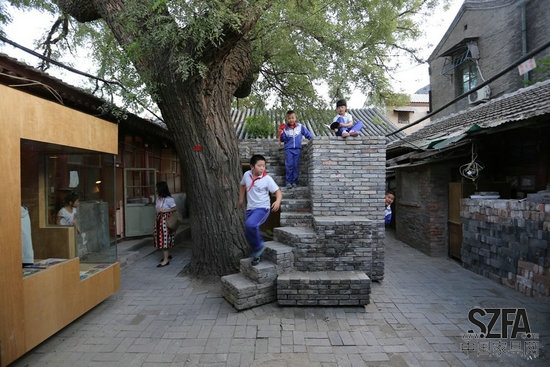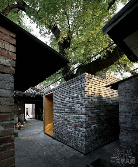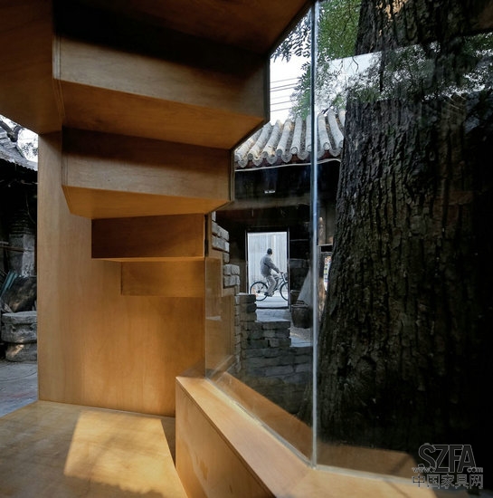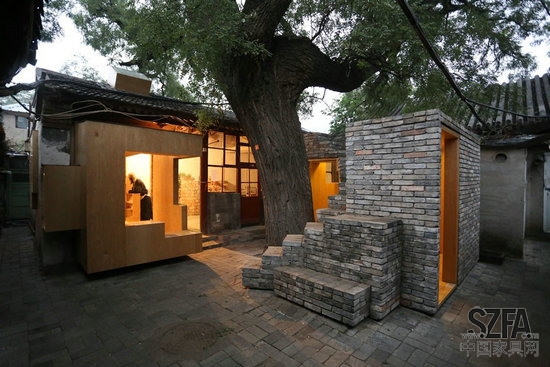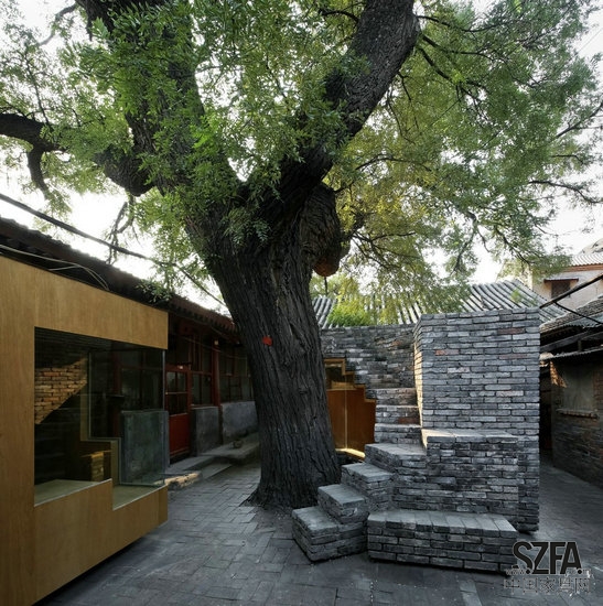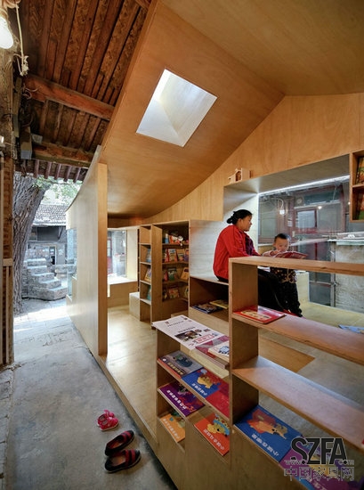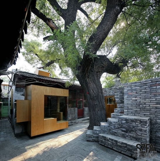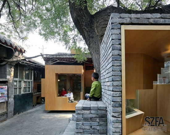 憑借在Cha'er胡同四合院小規(guī)模的干預(yù),建筑師嘗試加強(qiáng)社區(qū)之間的聯(lián)系,以此來豐富當(dāng)?shù)鼐用竦暮?。一個(gè)孩子可能會(huì)在放學(xué)后在他們的父母來接他們之前在這里停留,挑選出最喜歡的書,在迷你的空間里面閱讀。或者,孩子可能爬到樓頂或坐在樹蔭下,與在熟悉的,但新的空間里生活的中老年人享受一個(gè)舒適的談話。