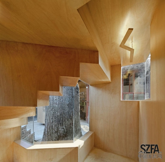 與仍然住在院子里的家庭共同生活,由膠合板建造的九平方米的兒童圖書館插入在現(xiàn)有建筑物的坡屋頂下。在一個(gè)大的白蠟樹,其中一個(gè)廚房被設(shè)計(jì)成做了一個(gè)六平方米的由傳統(tǒng)的藍(lán)灰色的磚建造成的迷你藝術(shù)空間。其外觀,由磚鋪的梯級的小樓梯通向樓頂,在那里人們可以伸手觸及到白蠟樹的樹葉和枝干。