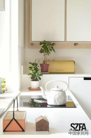 客廳另一端便是開放式的廚房與客廳,高挑的天花板,即使全家人在一起,但仍然有一點(diǎn)隱私。米白色的廚房與原木結(jié)合,墻上的隔板既能夠存儲(chǔ)東西,又成為很好的擺設(shè),一些綠植的點(diǎn)綴,更為可愛。