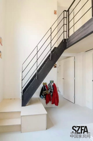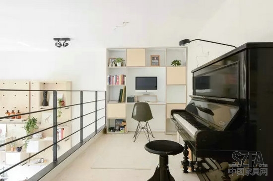 沿樓梯而上便是工作區(qū)域,用隔板隔出的工作區(qū)有效的利用了空間,一旁的鋼琴更顯屋主的志趣。