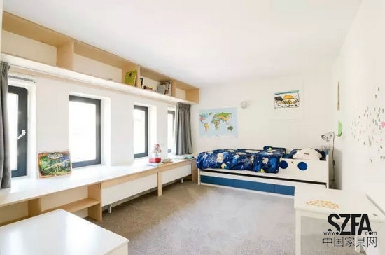 兒童房的設(shè)計(jì),以寬闊為主,給孩子充分的想像空間和自由空間。墻上貼著孩子自己的作品,這也是一種裝飾的巧妙方式。整個(gè)房間充滿童趣,想必也是孩子們的天堂。