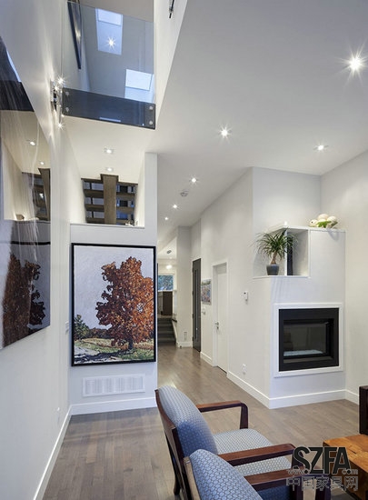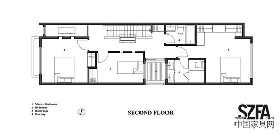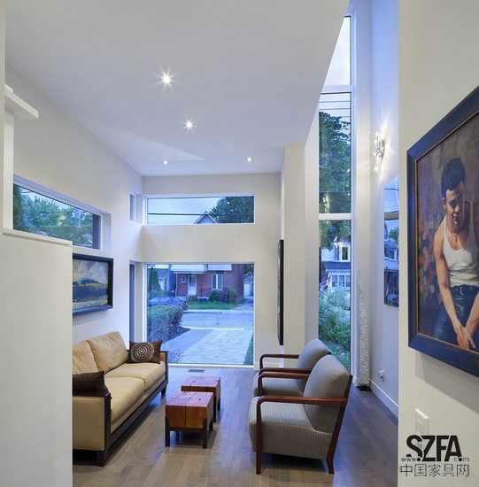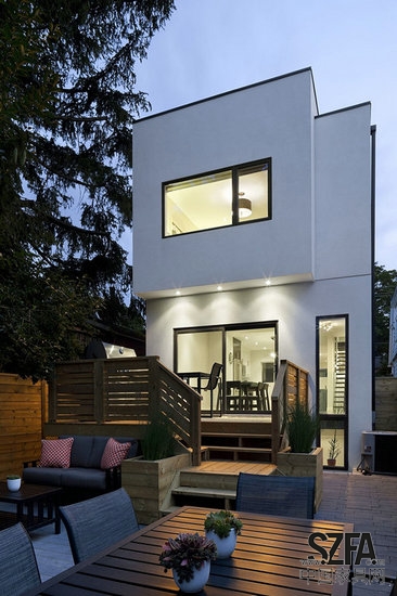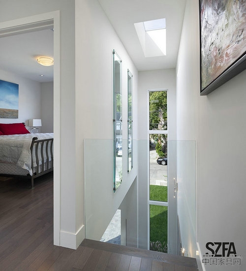 在主要樓層,甚至盡管居家房間只有十六英尺寬,臥室面積只有十四英尺寬,這里也并沒有感覺受到約束的感覺。這都要?dú)w功于位于臥室的十一英尺天花板與分離的地板設(shè)計(jì),這就消除了對于燈光缺乏的墻體的制約。當(dāng)你站在房子前面面對著生活區(qū)域,一個來自于細(xì)長窗子的盤旋燈光覆蓋了這個房間的三個立面,展現(xiàn)出了一種全景視角。房子的后面位于家庭房間另一側(cè),那里在后部平臺旁邊有一個外凸的窗子,它從主層樓板延伸到了地下一層。你會情不自禁的沐浴在陽光與這開敞空間里。在第二層,巨大的窗口設(shè)計(jì)用在臥室與走廊之間的銜接墻體上,讓開放的感覺彌漫。這樓的另一個非常特殊的特征是步入陽臺,它可以連接臥室與主套房。