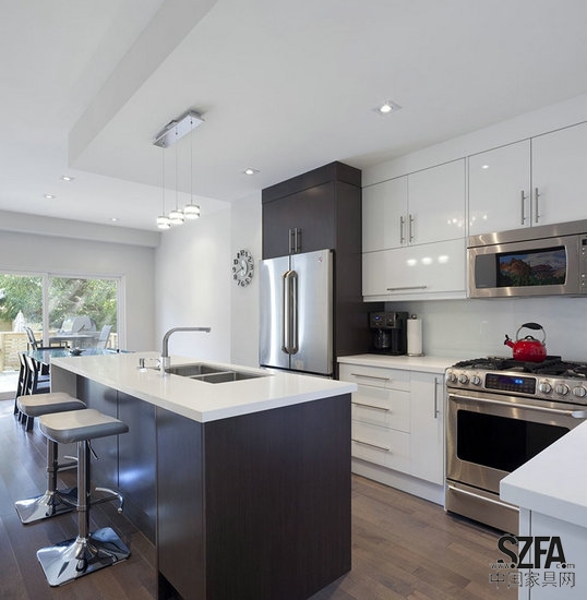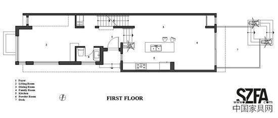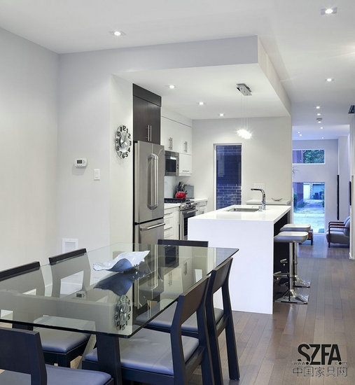這個線性設(shè)計(jì)的靈感誕生于狹窄基地的挑戰(zhàn)。盡管測量起來也只有二十英尺寬,但是內(nèi)部空間卻給人以更加寬敞的感覺,只是為了達(dá)到協(xié)調(diào)線形設(shè)計(jì)的設(shè)計(jì)意圖,并且創(chuàng)造性的開發(fā)了開放空間。這個設(shè)計(jì)的結(jié)果就是營造了一種寬敞的空間,自然光線的進(jìn)入絲毫不受阻礙。有意的定向貫穿房間來創(chuàng)造了一個可以產(chǎn)生一個有活力生存空間的光明。