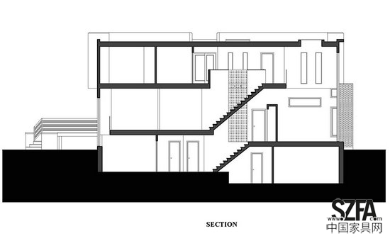 這個房子的重點(diǎn)在于前角。這個空間產(chǎn)生于兩個狹長的矩形窗子:其中一個在豎直方向的窗子高于兩層樓的高度,另一個水平方向的窗子,搭配一排燈,引導(dǎo)你到達(dá)被遮掩的主入口。當(dāng)你進(jìn)入時你對面便是一個包含無隔層樓板的玻璃塔,在它上方是來自天窗的雙層燈光,在它的后面,你會注意到這個單梁樓梯看起來像懸掛的并漂浮在開放空間里。這個主要的大廳樓梯因?yàn)橛羞@個它旁邊兩層玻璃塔而產(chǎn)生了一種釋放感與治愈性。