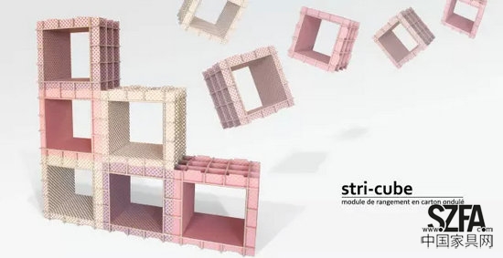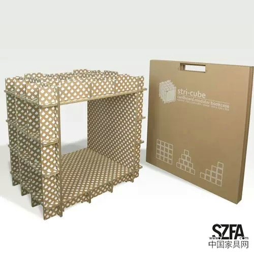 Stri-cube是用瓦楞紙做的模塊化書架。擁有一定厚度的瓦楞紙板,通過有趣的插接結(jié)構(gòu),可以搭建出一個(gè)立體的儲(chǔ)納家具,不需要任何膠水或者五金連接件。像是一套玩具,由使用者親自動(dòng)手完成安裝,童趣、環(huán)保且實(shí)用。