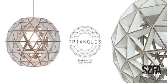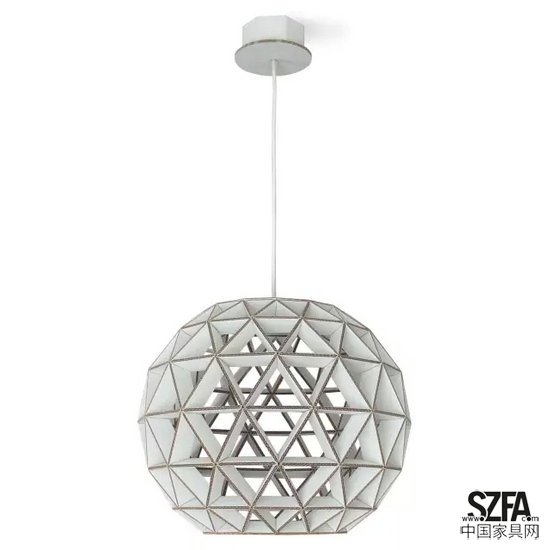 同樣用瓦楞紙插接而成的一款燈具。燈光通過三角拼接的紙質(zhì)燈罩投射下漂亮的陰影,白色的飾面與瓦楞紙咖色的截?cái)嗝娲钆淦饋硎趾啙嵏蓛簟?/p>