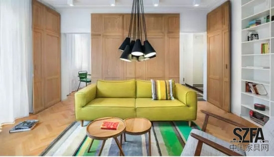 ↑整個(gè)公寓屬于一個(gè)開(kāi)放式的大空間,客廳內(nèi)有大規(guī)模的木板門(mén),它將分開(kāi)前廳和學(xué)習(xí)區(qū)域。充滿色彩的沙發(fā)和地毯搭配簡(jiǎn)單的茶幾,一旁的白色書(shū)架即能夠擺放書(shū)本也能放上一些裝飾物