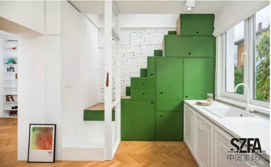 ↑設(shè)計(jì)師在樓梯下設(shè)計(jì)了隱藏收納柜,不過(guò)則跳動(dòng)的門(mén)片加上飽和的綠色,讓機(jī)能與趣味同時(shí)兼具。
