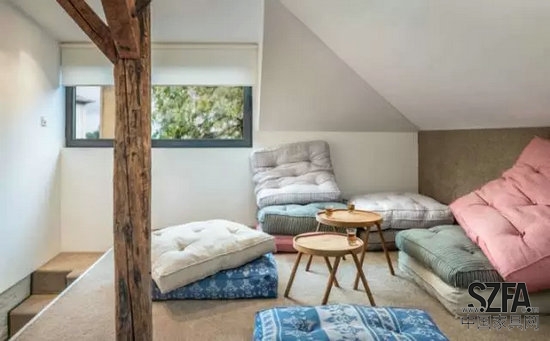 ↑高挑的閣樓規(guī)劃成休息室,就如同一個(gè)秘密基地一樣,擺放一些簡(jiǎn)單的小茶幾和幾塊坐墊配上窗外的美景,不管在這里放空還是看書(shū)也好,在這里安靜的享受私人時(shí)光,輕松美妙。