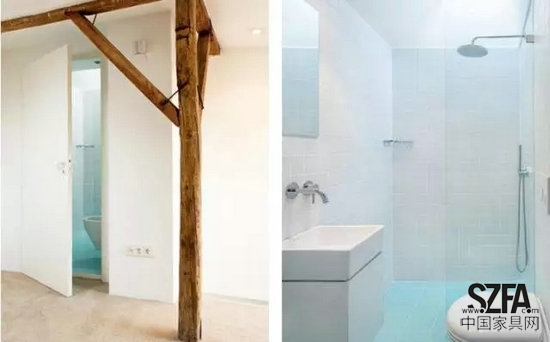 ↑臥室、衣帽間和獨(dú)立的浴室,麻雀雖小,五臟俱全。有趣的是臥室的白色大門(mén)也是客廳大書(shū)架的一部分,十分隱秘。浴室只是簡(jiǎn)約的瓷磚拼貼,淡藍(lán)色給人一種舒適的感覺(jué)。