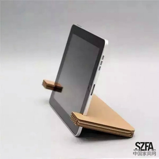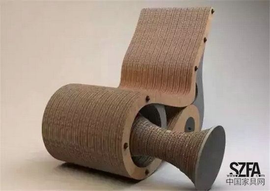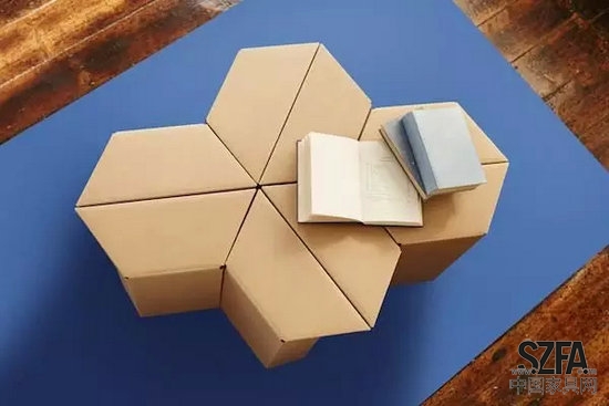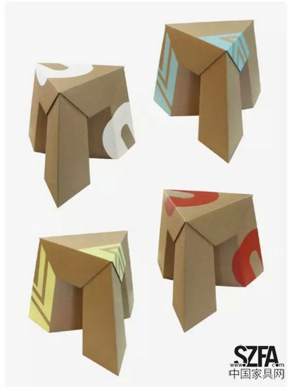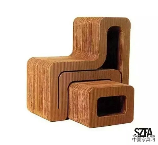 一把椅子,一個腳踏(兼具雜志架功能),一個茶幾,用多層瓦楞紙切割而成,拆卸、組合都非常方便,節(jié)省空間。