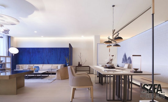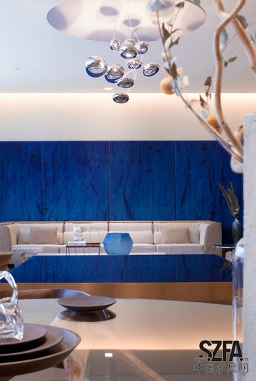 屏屏重屏屏。殘荷本來應(yīng)該是有點(diǎn)孤寂的,但此刻并沒有,黃葉本該也有點(diǎn)蕭瑟的,但此地也沒有。畫屏上的銀杏葉對(duì)于我來講代表的并不僅僅是其優(yōu)美的形狀或者是秋天的燦爛,更有別的故事和情愫在里面,暗含一生之約。層次豐富,黃的暖心,餐廳本來也該是如此的色調(diào),是屬于家的氛圍。荷葉荷梗則圍在另一邊的客廳幽藍(lán)月色行著,枯寂、寧靜、沉靜,呼應(yīng)著色彩在那模糊想象、在那說愛好表志向、在那提君子之交……