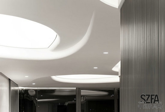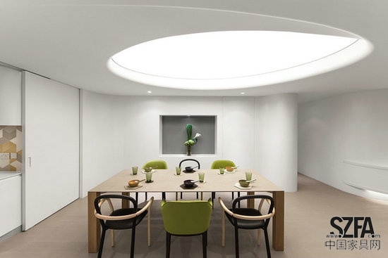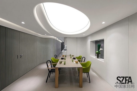 在房間中心,三個(gè)大漩渦模擬住宅的天窗。這些特色燈分別固定在餐廳、客廳和浴室,柔和均勻的白光投射在每個(gè)空間,突出單色室內(nèi)的優(yōu)雅感覺(jué)。
