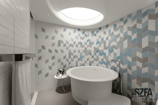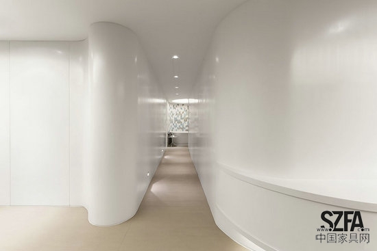 兩條狹長(zhǎng)的走廊采用曲面墻作為內(nèi)壁,一條包圍廚房和服務(wù)區(qū),另一條引向臥室和公共浴室。無(wú)縫長(zhǎng)廊框起雕塑般的獨(dú)立白色浴缸。顯露部分將居住者引入浴室,溫馨彎曲的房間包蓋著漸進(jìn)藍(lán)色的六角形穆蒂納墻磚。