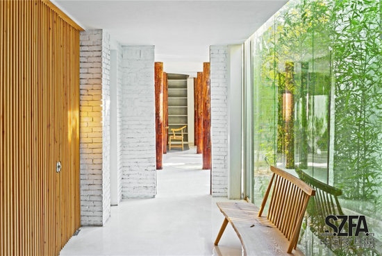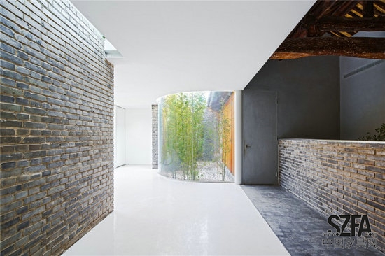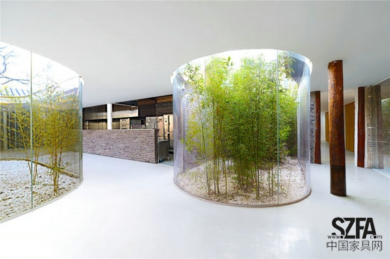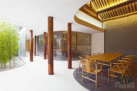 在傳統(tǒng)建筑中,廊是一種半內(nèi)半外的空間形式,它的曲折多變、高低錯落,大大增加了游園的樂趣。猶如樹枝分岔的曲廊從室外伸展到舊建筑內(nèi)部,模糊了院與房的邊界,改變院子呆板狹窄的印象。輕盈、透明、純白的廊空間與厚重、滄桑、灰暗的舊建筑形成氣質(zhì)上的反差,新的更新、老的更老,拉開時間上的層疊,新與舊相互產(chǎn)生對話。曲廊在原有院子中劃分了三個錯落的弧形小院,使每一個茶室有獨立的室外景致,在公共和私密之間產(chǎn)生過渡。曲廊的玻璃幕墻好似一個懸浮地面之上的弧形屏幕,將竹林景觀和舊建筑形式投射到茶室之中,新與舊的影像相互疊加。曲廊同時具有舊建筑的結(jié)構(gòu)作用,廊的鋼結(jié)構(gòu)梁柱替換了局部舊建筑中腐朽的木材,使新與舊“長”在了一起。