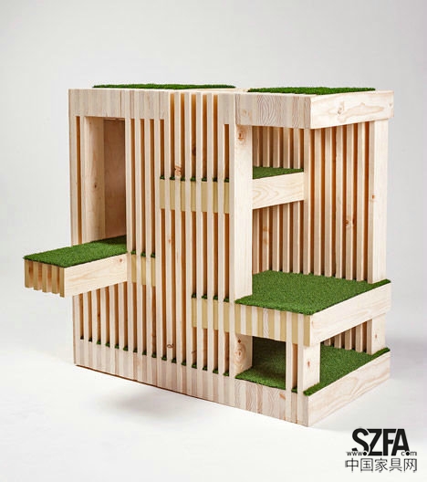 Wolcott Architecture Interiors 的貓屋有幼兒園的即視感。下面這些貓屋更像是游樂場,有各種錯落的支點讓貓咪爬上爬下,不過遮風(fēng)擋雨的功能嘛,幾乎沒有。